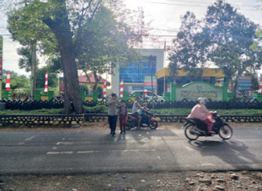 Petugas terlihat membantu para siswa menyeberang jalan dan mengatur kendaraan agar tidak terjadi kemacetan di depan sekolah. Selama pelaksanaan kegiatan, situasi arus lalu lintas terpantau aman, lancar, dan kondusif.