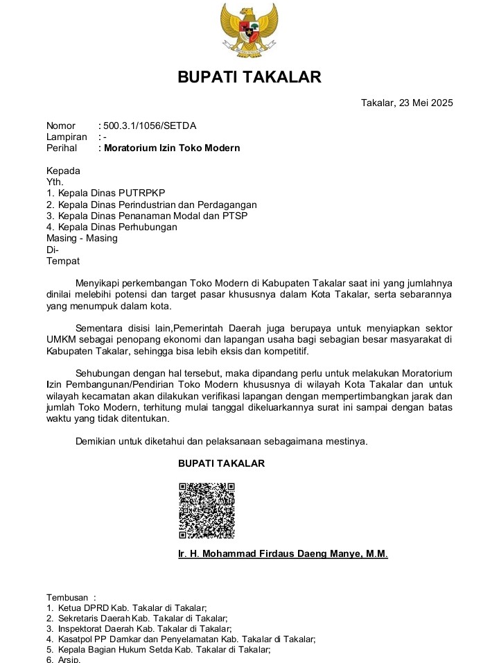 jumlah Toko Modern, terhitung mulai tanggal dikeluarkannya surat ini sampai dengan batas waktu yang tidak ditentukan,” demikian surat tertanggal 23 Mei 2025 yang ditandatangani Bupati Takalar.