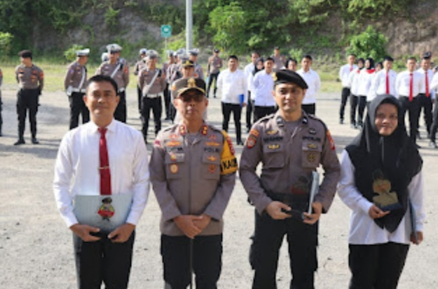 Kapolres memberikan penghargaan kepada tiga personel dengan kategori Sangat Disiplin, yakni IPDA Arwin, AIPDA Nurwandi, dan BRIGPOL Irmadayani.