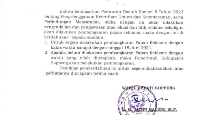 KABAR-SATU,SOPPENG — Pemerintah Kabupaten Soppeng melalui Satpol PP, BPKAD, dan SKPD, melakukan tindakan tegas dengan meratakan sejumlah billboard di duga ilegal di jalan-jalan utama Kota Watansoppeng. Selasa (25/6/2024).