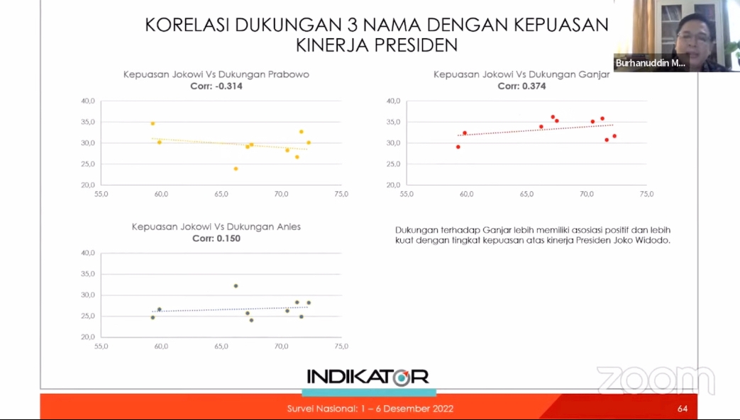 “Yang menarik ini Pak Prabowo, awalnya nggak ada korelasi apapun dengan approval rating Pak Jokowi, Direktur Indikator Politik Burhanuddin Muhtadi saat memaparkan hasil survei, Rabu (4/1/2023).